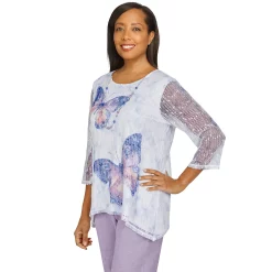 Beautiful watercolor butterflies float on this petites’ Alfred Dunner popcorn mesh knit top.