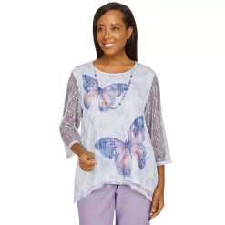 Beautiful watercolor butterflies float on this petites’ Alfred Dunner popcorn mesh knit top.